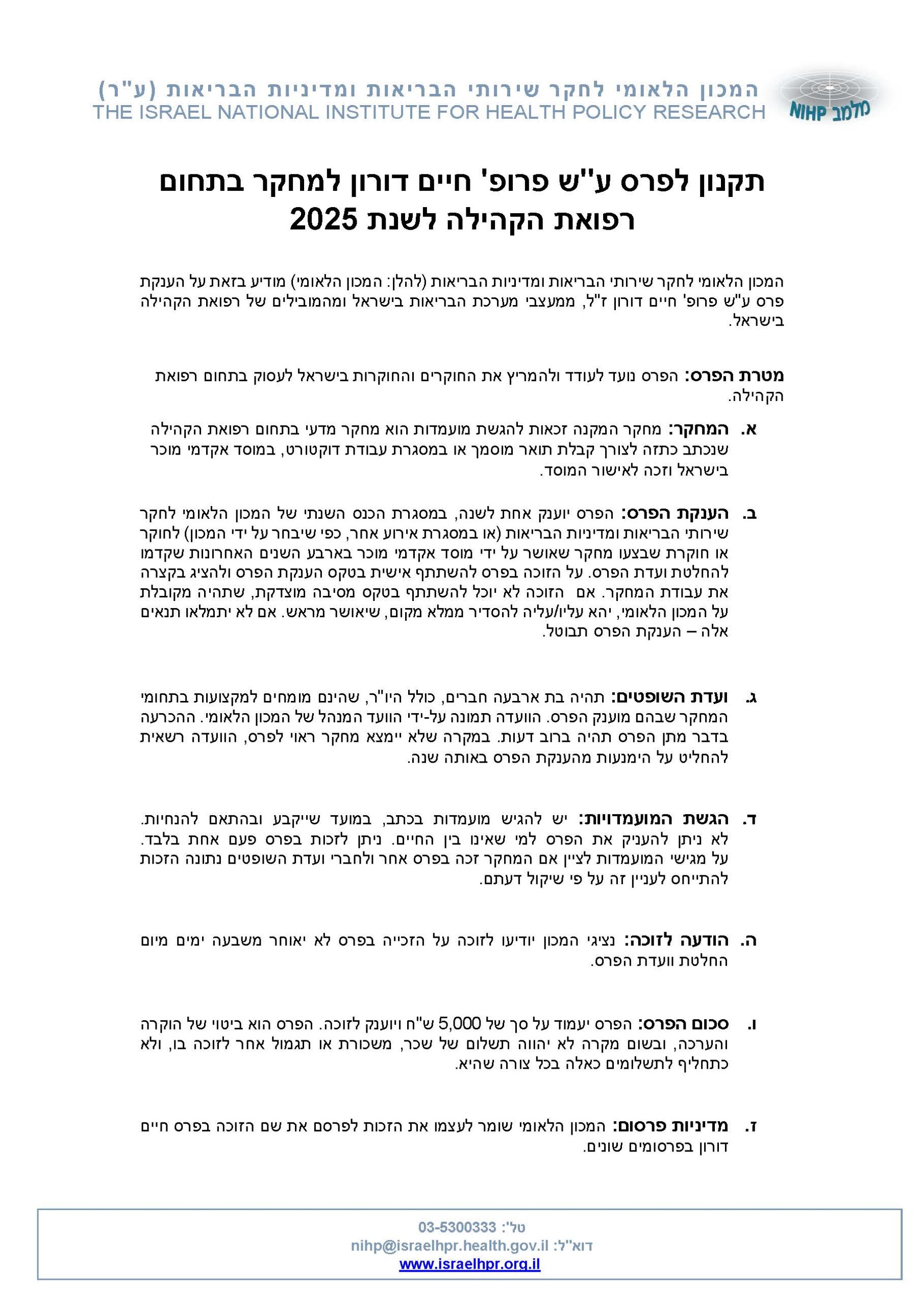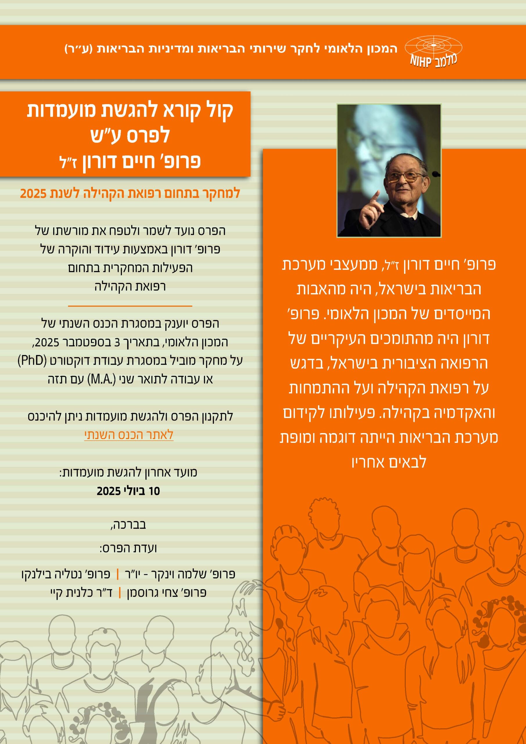 קול קורא להגשת מועמדות לפרס ע"ש פרופ' חיים דורון ז"ל